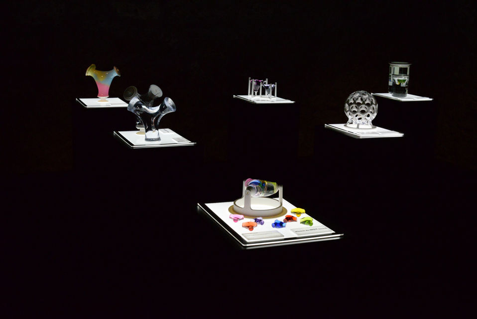 The exhibit showcases LiquiFab elements created in a neutral buoyancy environment that simulates weightlessness, as well as videos of experiments performed on board the International Space Station.